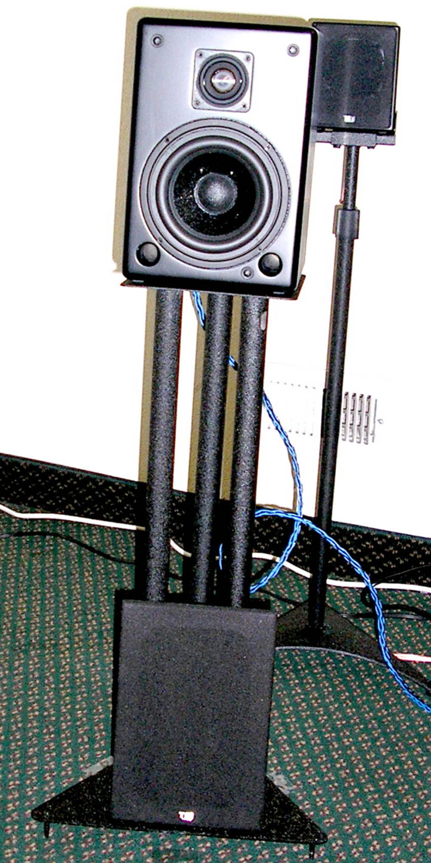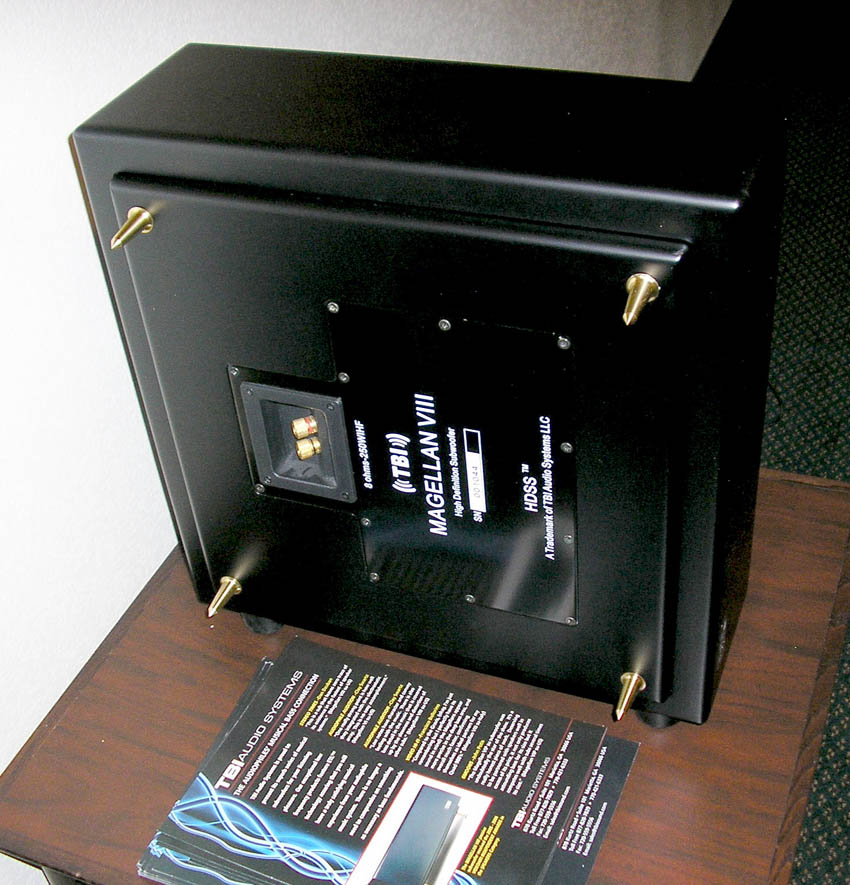 The TBI MAGELLIAN VIII on its side with floor spikes. It can be placed on its side or flat with the spikes into the carpet.