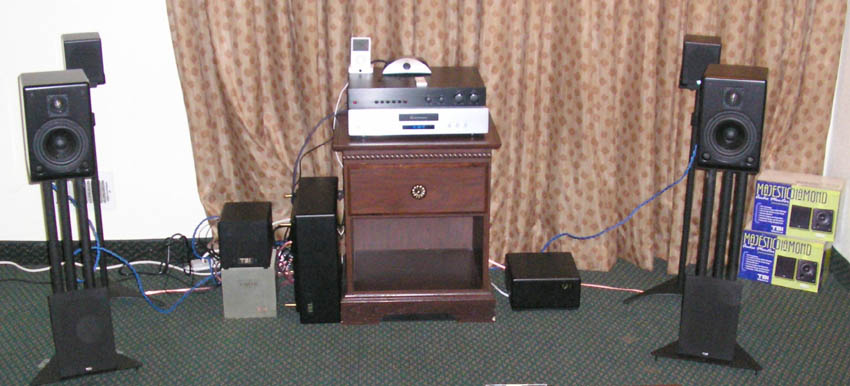 The new 2-way Majestic Diamond 2 loudspeakers on stands playing with a Magellan VIII sub (on its side with foot spikes), powered by a TBI 200su amplifier/crossover. Behind them are the tiny Majestic Diamonds (also on stands). Both have amazing sound both for their size and for price. The Majestic Diamonds are only $400/pair. The 2-way Majestic Diamond 2 will probably list at under $1,000/pair. The The new 2-way Majestic Diamond 2s converge at only 6 inches so they can be used as near-field monitors but will easily fill a medium to medium-large room with uncompressed sound for both music and home theater. Both systems exhibit great imaging with almost no "sweet spot.? The listener can be a little to the left of the left loudspeaker and fully appreciate the music from the right loudspeaker, a feat few, if any, other designs can match.